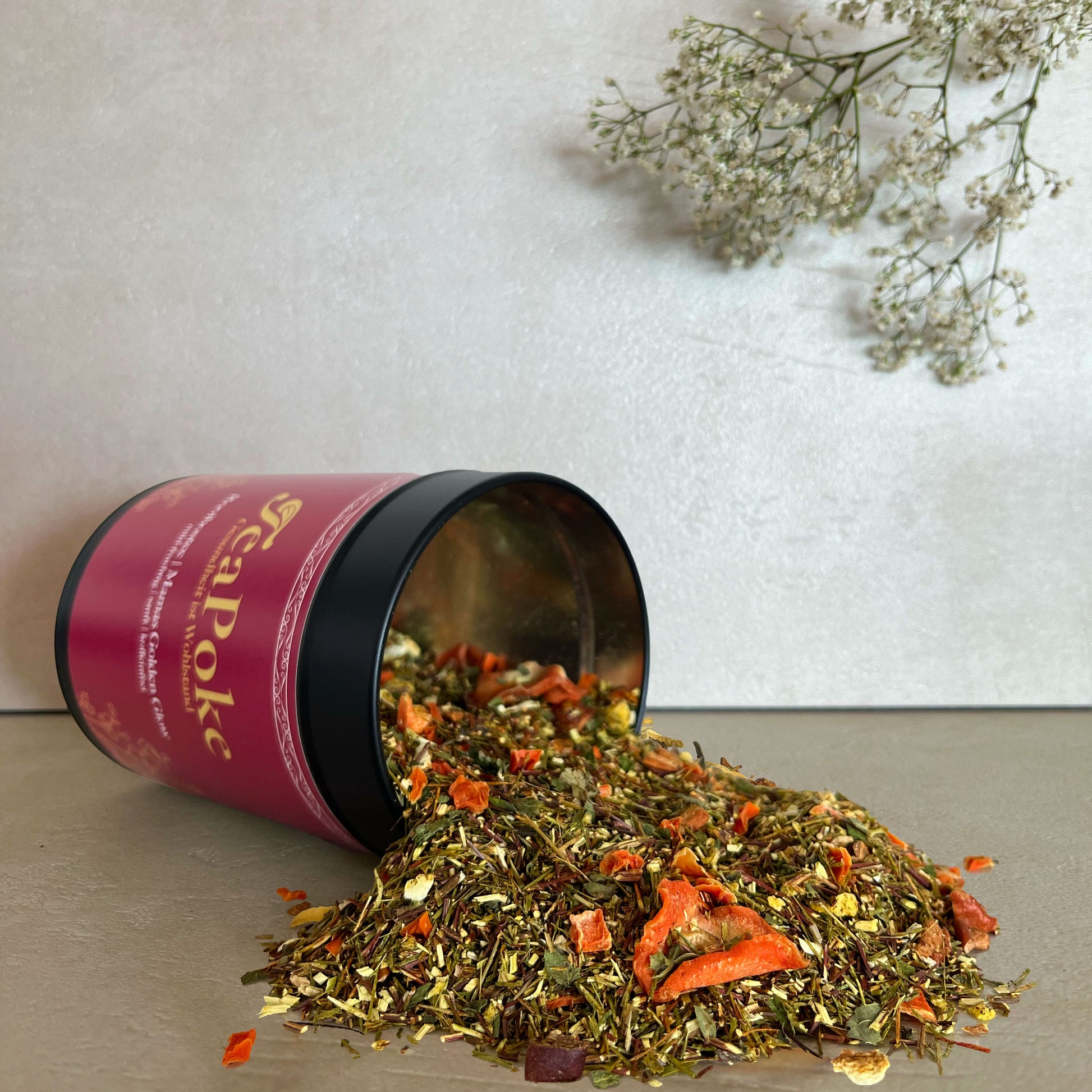 Grüner Rooibos bildet die weiche Basis, während Apfel, Karotte und Orangenschale einen natürlichen, süß-frischen Geschmack zaubern. Zitronenmelisse sorgt für innere Ausgeglichenheit – ein Tee wie eine sanfte Umarmung für Mama und Baby.